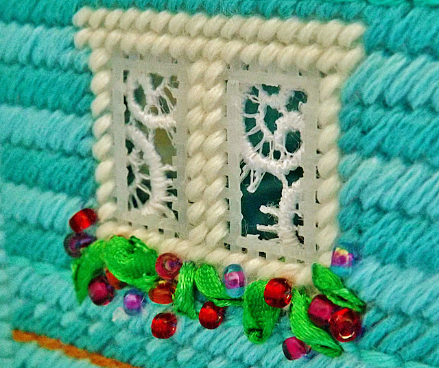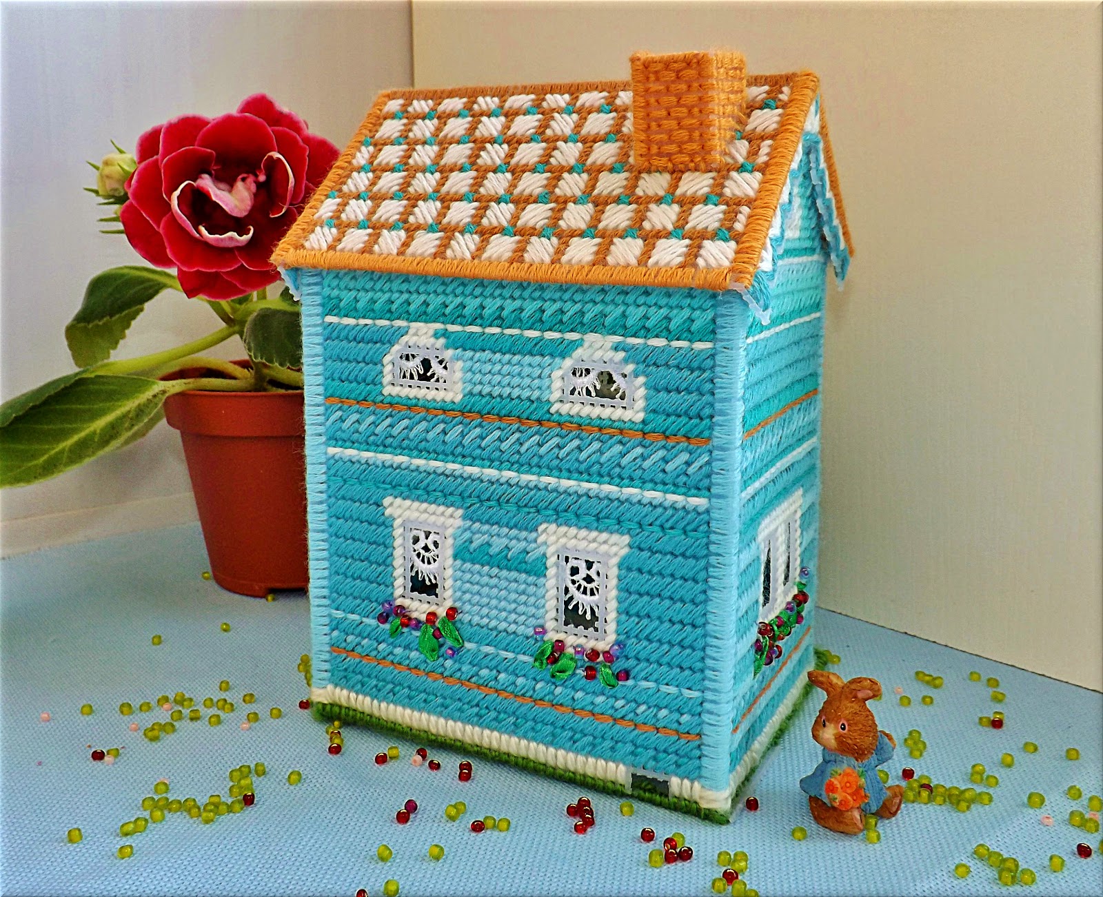 Как-то мне поступил заказ. Нужен вышитый объёмный домик, который будет служить ночником для малыша. Поиски подходящего дизайна успехом не увенчались. То слишком маленький, то какой-то невзрачный. Остается придумать свой дом. За основу будущего "строительства" был выбран дизайн Bucilla, в который я внесла значительные изменения. Так у моего домика появился второй этаж. Чтобы домик действительно стал ночником я прорезала окошки, на которые "повесила" зановесочки из кружев. Цветы получились из лент и бисера.Вот что у меня получилось. Мне даже было немного жаль расставаться с такой милой игрушкой.